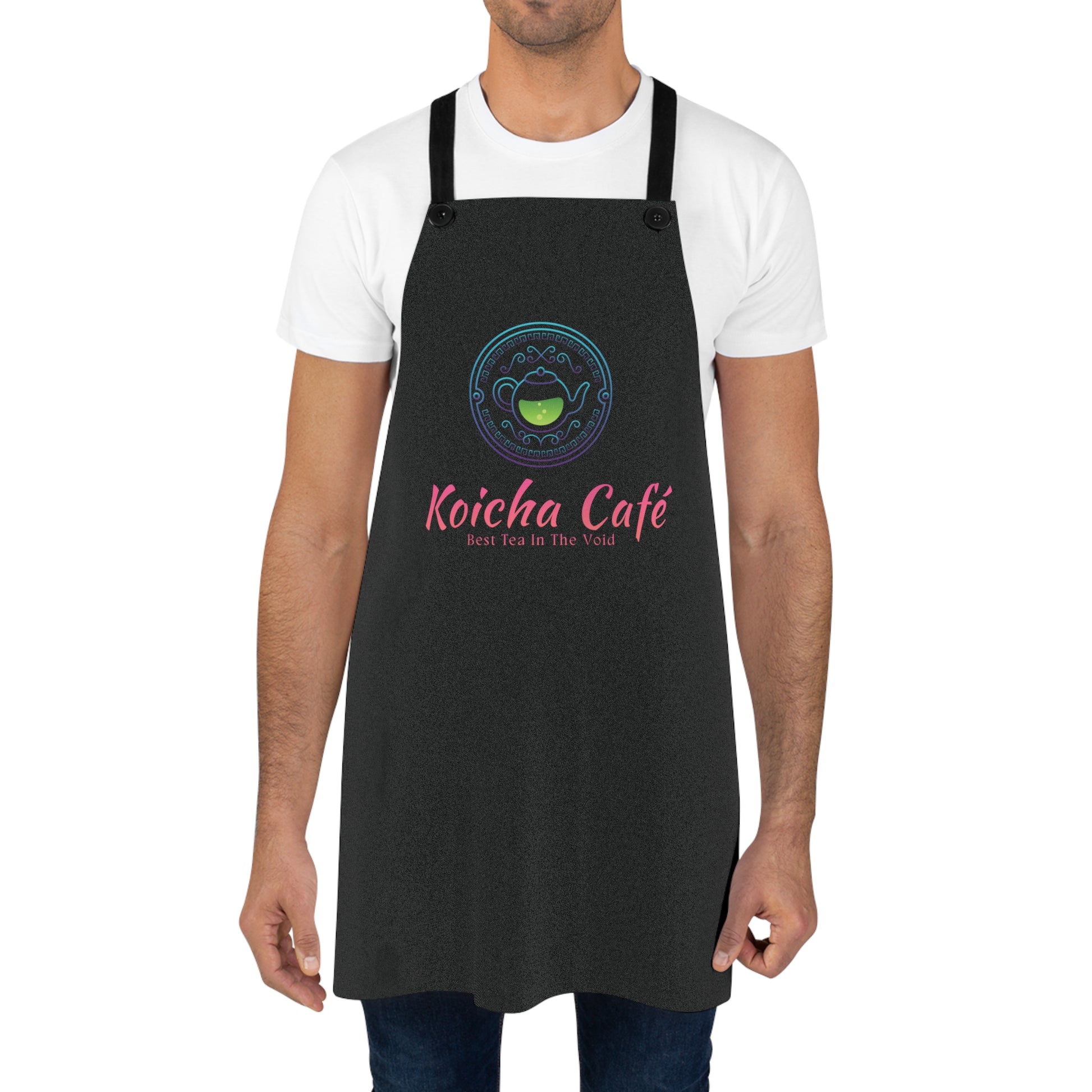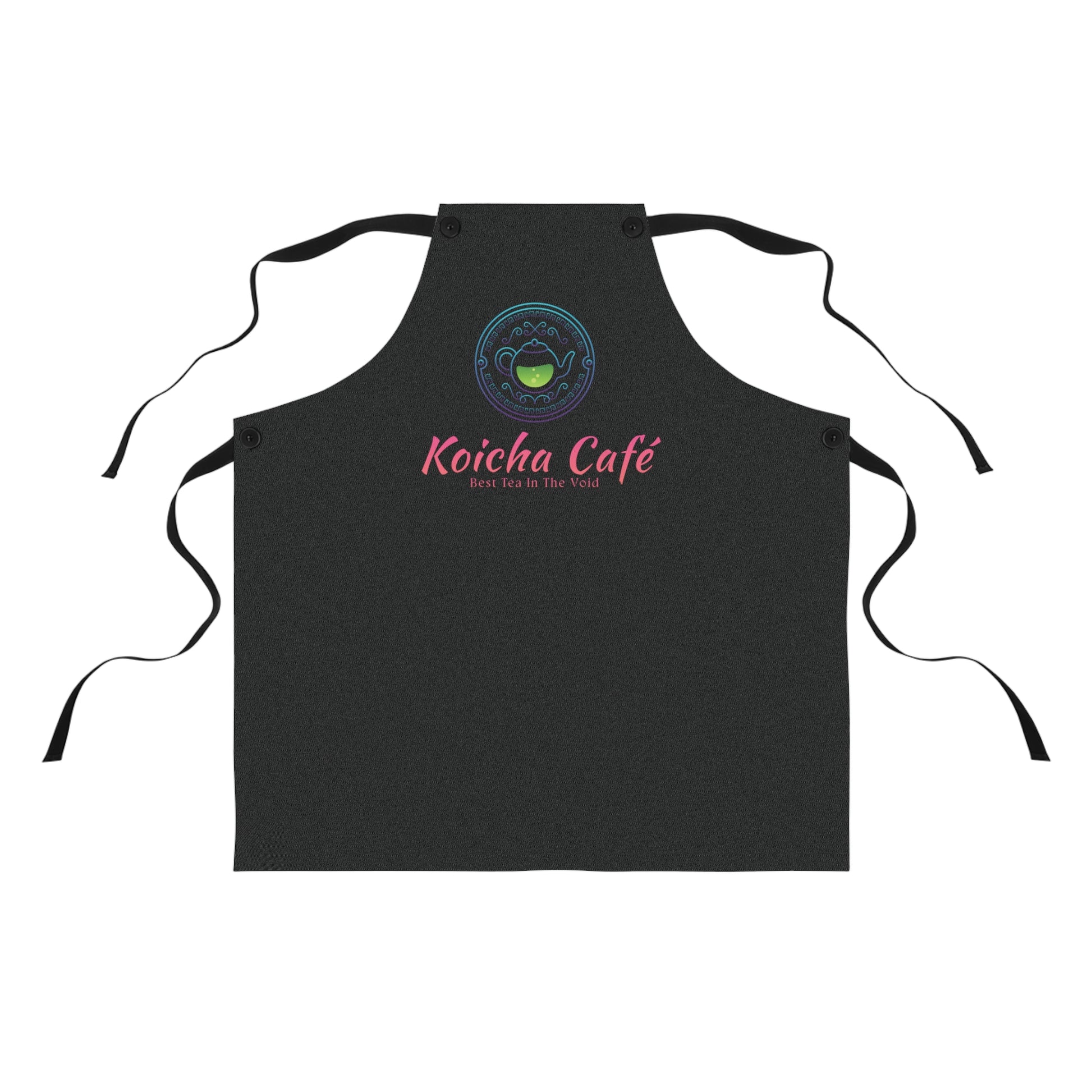 Ever wanted to work at the Koicha Café? Well with this apron you can pretend you are! Made from durable, quick-drying polyester, it wears well through busy shifts and weekend baking sessions. The rich black background makes the Koicha Café logo pop in soft neon pink and teal, adding a cozy, modern vibe that feels both playful and professional. Buttonholes let you detach the twill straps for easy cleaning or replacement, and reinforced overlocked seams stand up to frequent use. Wear it when pulling espresso shots, handcrafting matcha treats, or hosting an intimate afternoon tea — it sits comfortably across the chest and keeps you looking put-together while you work.